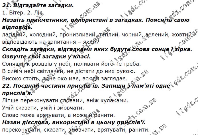 21. Відгадайте загадки. 1. Вітер. 2. Ліс. Назвіть прикметники, використані в загадках. Поясніть свою відповідь. лагідний, холодний, пронизливий, теплий, чорний, зелений, жовтий – відповідають на запитання – який? Складіть загадки, відгадками яких будуть слова сонце і зірка. Озвучте свої загадки у класі. Соняшник розцвів у небі, поливати його не треба. В синім небі світлячки, не дістати до них рукою. Високо стоїть, одне око має, всюди заглядає. 22. Поєднай частини прислів'їв. Запиши з пам'яті одне прислів'я. Ліпше переконувати словами, аніж кулаками. Умій сказати, умій і змовчати. Слово може врятувати, а може й ранити. Назви дієслова, використані в цьому прислів'ї. переконувати, сказати, змовчати, врятувати, ранити.