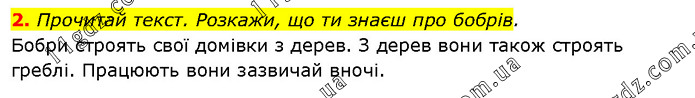 Прочитай текст. Розкажи, що ти знаєш про бобрів. Бобри строять свої домівки з дерев. З дерев вони також строять греблі. Працюють вони зазвичай вночі.