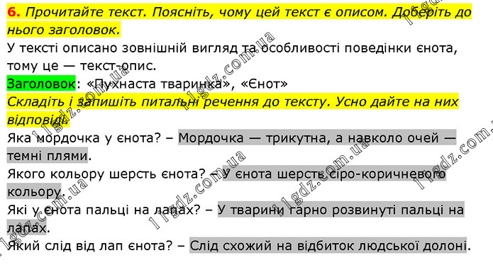 Прочитайте текст. Поясніть, чому цей текст є описом. Доберіть до нього заголовок. У тексті описано зовнішній вигляд та особливості поведінки єнота, тому це — текст-опис. Заголовок: «Пухнаста тваринка», «Єнот» Складіть і запишіть питальні речення до тексту. Усно дайте на них відповіді. Яка мордочка у єнота? – Мордочка — трикутна, а навколо очей — темні плями. Якого кольору шерсть єнота? – У єнота шерсть сіро-коричневого кольору. Які у єнота пальці на лапах? – У тварини гарно розвинуті пальці на лапах. Який слід від лап єнота? – Слід схожий на відбиток людської долоні.