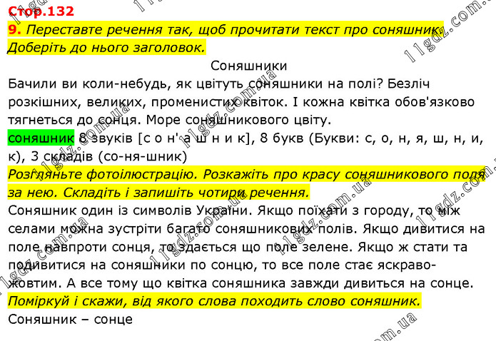 Переставте речення так, щоб прочитати текст про соняшник. Доберіть до нього заголовок. Соняшники Бачили ви коли-небудь, як цвітуть соняшники на полі? Безліч розкішних, великих, променистих квіток. І кожна квітка обов'язково тягнеться до сонця. Море соняшникового цвіту. соняшник 8 звуків [с о н' а ш н и к], 8 букв (Букви: с, о, н, я, ш, н, и, к), 3 складів (со-ня-шник) Розгляньте фотоілюстрацію. Розкажіть про красу соняшникового поля за нею. Складіть і запишіть чотири речення. Соняшник один із символів України. Якщо поїхати з городу, то між селами можна зустріти багато соняшникових полів. Якщо дивитися на поле навпроти сонця, то здається що поле зелене. Якщо ж стати та подивитися на соняшники по сонцю, то все поле стає яскраво-жовтим. А все тому що квітка соняшника завжди дивиться на сонце. Поміркуй і скажи, від якого слова походить слово соняшник. Соняшник – сонце