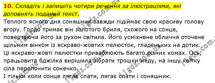 Складіть і запишіть чотири речення за ілюстраціями, які доповнять поданий текст. Теплого ясного дня соняшник завжди підіймає свою красиву голову вгору. Гордо тримає він золотого бриля, схожого на сонце, повертаючи його за рухом світила. Його усміхнене обличчя оточене щільним вінком із яскраво-жовтих пелюсток, гладеньких на дотик. Ці яскраво-жовті пелюстки приваблюють багато різних комах. Ось, працьовита бджілка вирішила зібрати трошки меду, на іншу квітку сіла перепочити сонечко. І тільки коли сонце лягає спати, лягає спати і соняшник.