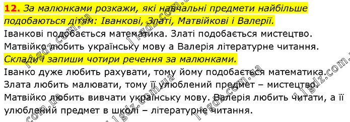За малюнками розкажи, які навчальні предмети найбільше подобаються дітям: Іванкові, Златі, Матвійкові і Валерії. Іванкові подобається математика. Златі подобається мистецтво. Матвійко любить українську мову а Валерія літературне читання. Склади і запиши чотири речення за малюнками. Іванко дуже любить рахувати, тому йому подобається математика. Злата любить малювати, тому її улюблений предмет – мистецтво. Матвійко любить вивчати українську мову. Валерія любить читати, а її улюблений предмет в школі – літературне читання.