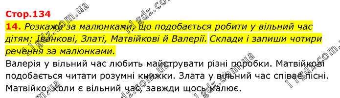 Розкажи за малюнками, що подобається робити у вільний час дітям: Іванкові, Златі, Матвійкові й Валерії. Склади і запиши чотири речення за малюнками. Валерія у вільний час любить майструвати різні поробки. Матвійкові подобається читати розумні книжки. Злата у вільний час співає пісні. Матвійко, коли є вільний час, завжди щось малює.