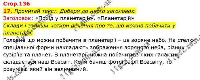 Прочитай текст. Добери до нього заголовок. Заголовок: «Похід у планетарій», «Планетарій» Склади і запиши чотири речення про те, що можна побачити у планетарії. Головне що можна побачити в планетарії – це зоряне небо. На стелю спеціальної форми накладають зображення зоряного неба, різних сузір’їв та планет. В планетарії можна побачити з яких галактик складається наш Всесвіт. Коли бачиш фотографії Всесвіту, то розумієш який він величезний.