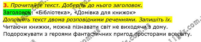 Прочитайте текст. Доберіть до нього заголовок. Заголовок: «Бібліотека», «Домівка для книжок» Доповніть текст двома розповідними реченнями. Запишіть їх. Читаючи книжки, можна пізнавати світ не виходячи з дому. Подорожувати з героями фантастичних пригод просторами всесвіту.