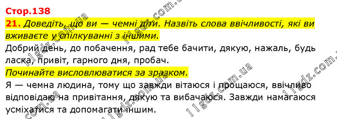 Доведіть, що ви — чемні діти. Назвіть слова ввічливості, які ви вживаєте у спілкуванні з іншими. Добрий день, до побачення, рад тебе бачити, дякую, нажаль, будь ласка, привіт, гарного дня, пробач. Починайте висловлюватися за зразком. Я — чемна людина, тому що завжди вітаюся і прощаюся, ввічливо відповідаю на привітання, дякую та вибачаюся. Завжди намагаюся усміхатися та допомагати іншим.