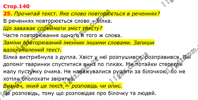 Прочитай текст. Яке слово повторюється в реченнях? В реченнях повторюється слово – білка. Що заважає сприймати зміст тексту? Часте повторювання одного й того ж слова. Заміни повторюваний іменник іншими словами. Запиши вдосконалений текст. Білка вистрибнула з дупла. Хвіст у неї розпушився, розправився. Він допоміг тваринки спуститися вниз по гілках. Ми потайки стерегли малу пустунку очима. Не наважувалися рушити за білочкою, бо не хотіли сполохати звірятко. Визнач, який це текст — розповідь чи опис. Це розповідь, тому що розповідає про білочку та людей.