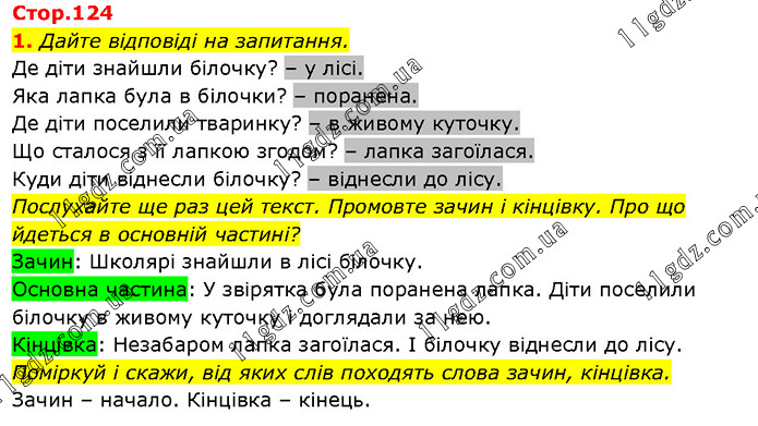 Дайте відповіді на запитання. Де діти знайшли білочку? – у лісі. Яка лапка була в білочки? – поранена. Де діти поселили тваринку? – в живому куточку. Що сталося з її лапкою згодом? – лапка загоїлася. Куди діти віднесли білочку? – віднесли до лісу. Послухайте ще раз цей текст. Промовте зачин і кінцівку. Про що йдеться в основній частині? Зачин: Школярі знайшли в лісі білочку. Основна частина: У звірятка була поранена лапка. Діти поселили білочку в живому куточку і доглядали за нею. Кінцівка: Незабаром лапка загоїлася. І білочку віднесли до лісу. Поміркуй і скажи, від яких слів походять слова зачин, кінцівка. Зачин – начало. Кінцівка – кінець.