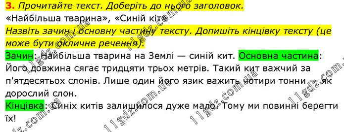 Прочитайте текст. Доберіть до нього заголовок. «Найбільша тварина», «Синій кіт» Назвіть зачин і основну частину тексту. Допишіть кінцівку тексту (це може бути окличне речення). Зачин: Найбільша тварина на Землі — синій кит. Основна частина: Його довжина сягає тридцяти трьох метрів. Такий кит важчий за п'ятдесятьох слонів. Лише один його язик важить чотири тонни — як дорослий слон. Кінцівка: Синіх китів залишилося дуже мало. Тому ми повинні берегти їх!