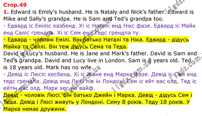 Edward is Emily’s husband. He is Nataly and Nick’s father. Edward is Mike and Sally’s grandpa. He is Sam and Ted’s grandpa too. - Едвард іс Еміліс хазбенд. Хі іс Наталі енд Нікс фазе. Едвард іс Майк енд Саліс грендпа. Хі іс Сем енд Тедс грендпа ту. - Едвард - чоловік Емілі. Він батько Наталі та Ніка. Едвард - дідусь Майка та Саллі. Він теж дідусь Сема та Теда. David is Lucy’s husband. He is Jane and Mark’s father. David is Sam and Ted’s grandpa. David and Lucy live in London. Sam is 8 years old. Ted is 18 years old. Mark has no wife. - Девід іс Люсіс хесбенд. Хі іс Жане енд Маркс фазе. Девід іс Сем енд тедс грендпа. Девід енд Люсі лів ін Лондон. Сем іс ейт еас олд. Тед іс ейтін еас олд. Марк хес но вайф. Девід - чоловік Люсі. Він батько Джейн і Марка. Девід - дідусь Сем і Теда. Девід і Люсі живуть у Лондоні. Сему 8 років. Теду 18 років. У Марка немає дружини.