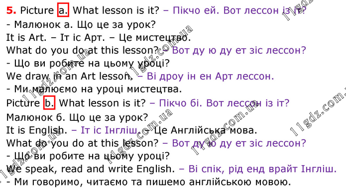 5. Picture a. What lesson is it? – Пікчо ей. Вот лессон із іт? - Малюнок a. Що це за урок? It is Art. – Іт іс Арт. – Це мистецтво. What do you do at this lesson? – Вот ду ю ду ет зіс лессон? - Що ви робите на цьому уроці? We draw in an Art lesson. – Ві дроу ін ен Арт лессон. - Ми малюємо на уроці мистецтва. Picture b. What lesson is it? – Пікчо бі. Вот лессон із іт? Малюнок б. Що це за урок? It is English. – Іт іс Інгліш. – Це Англійська мова. What do you do at this lesson? – Вот ду ю ду ет зіс лессон? - Що ви робите на цьому уроці? We speak, read and write English. – Ві спік, рід енд врайт Інгліш. - Ми говоримо, читаємо та пишемо англійською мовою.