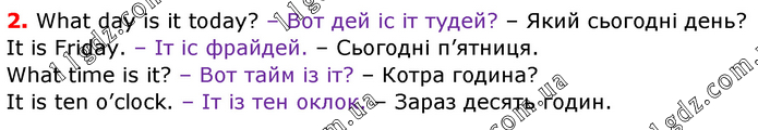 2. What day is it today? – Вот дей іс іт тудей? – Який сьогодні день? It is Friday. – Іт іс фрайдей. – Сьогодні п’ятниця. What time is it? – Вот тайм із іт? – Котра година? It is ten o’clock. – Іт із тен оклок. – Зараз десять годин.