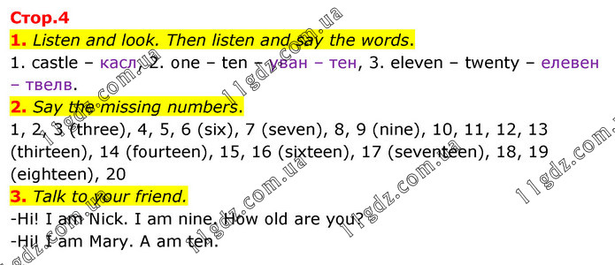 1. Listen and look. Then listen and say the words. 1. castle – касл, 2. one – ten – уван – тен, 3. eleven – twenty – елевен – твелв. 2. Say the missing numbers. 1, 2, 3 (three), 4, 5, 6 (six), 7 (seven), 8, 9 (nine), 10, 11, 12, 13 (thirteen), 14 (fourteen), 15, 16 (sixteen), 17 (seventeen), 18, 19 (eighteen), 20 3. Talk to your friend. -Hi! I am Nick. I am nine. How old are you? -Hi! I am Mary. A am ten.