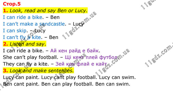 1. Look, read and say Ben or Lucy. I can ride a bike. – Ben I can’t make a sandcastle. – Lucy I can skip. – Lucy I can’t fly a kite. – Ben 2. Listen and say. I can ride a bike. – Ай кен райд е байк. She can’t play football. – Щі кент плей футбол. They can fly a kite. – Зей кен флай е кайт. 3. Look and make sentences. Lucy can paint. Lucy cant play football. Lucy can swim. Ben cant paint. Ben can play football. Ben can swim.