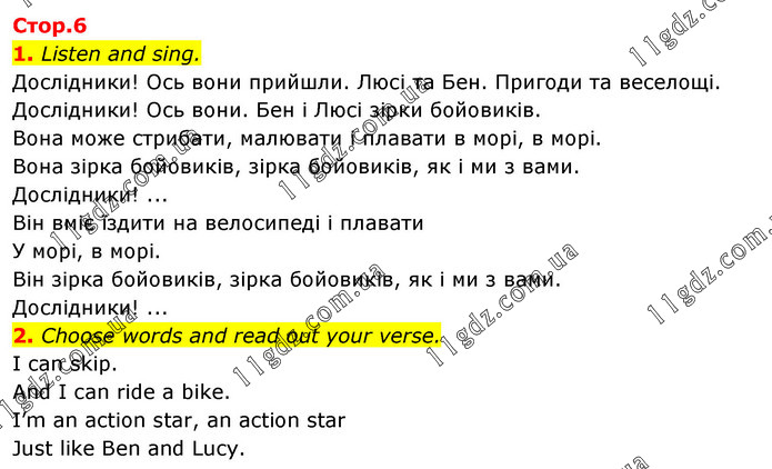 1. Listen and sing. Дослідники! Ось вони прийшли. Люсі та Бен. Пригоди та веселощі. Дослідники! Ось вони. Бен і Люсі зірки бойовиків. Вона може стрибати, малювати і плавати в морі, в морі. Вона зірка бойовиків, зірка бойовиків, як і ми з вами. Дослідники! ... Він вміє їздити на велосипеді і плавати У морі, в морі. Він зірка бойовиків, зірка бойовиків, як і ми з вами. Дослідники! ... 2. Choose words and read out your verse. I can skip. And I can ride a bike. I’m an action star, an action star Just like Ben and Lucy.