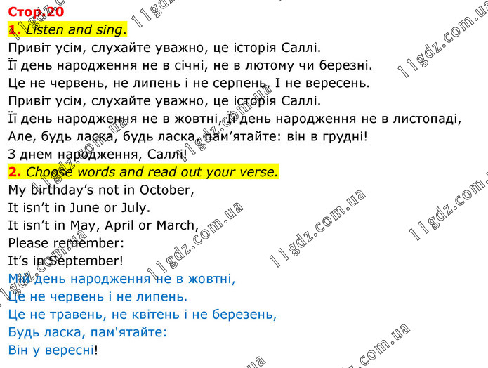 1. Listen and sing. Привіт усім, слухайте уважно, це історія Саллі. Її день народження не в січні, не в лютому чи березні. Це не червень, не липень і не серпень, І не вересень. Привіт усім, слухайте уважно, це історія Саллі. Її день народження не в жовтні, Її день народження не в листопаді, Але, будь ласка, будь ласка, пам’ятайте: він в грудні! З днем народження, Саллі! 2. Choose words and read out your verse. My birthday’s not in October, It isn’t in June or July. It isn’t in May, April or March, Please remember: It’s in September! Мій день народження не в жовтні, Це не червень і не липень. Це не травень, не квітень і не березень, Будь ласка, пам'ятайте: Він у вересні!