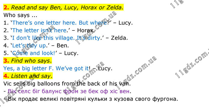 2. Read and say Ben, Lucy, Horax or Zelda. Who says ... 1. ‘There’s one letter here. But where?’ – Lucy. 2. ‘The letter isn’t here.’ – Horax. 3. ‘I don’t like this village. It’s dirty.’ – Zelda. 4. ‘Let’s tidy up.’ – Ben. 5. ‘Come and look!’ – Lucy. 3. Find who says. Yes, a big letter F. We’ve got it! – Lucy. 4. Listen and say. Vic sells big balloons from the back of his van. - Вік селс біг балунс фром зе бек оф хіс вен. - Вік продає великі повітряні кульки з кузова свого фургона.