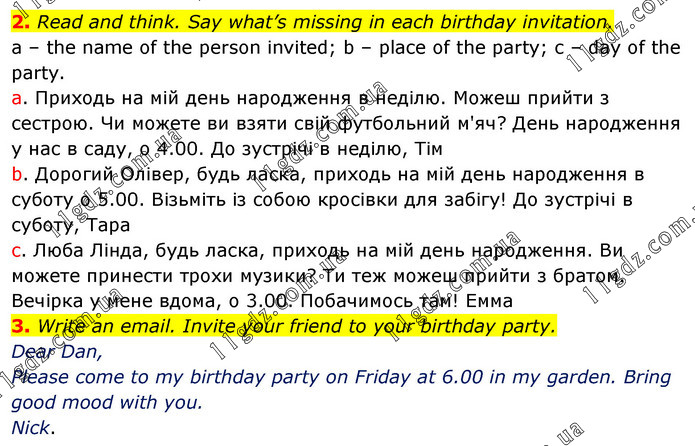 2. Read and think. Say what’s missing in each birthday invitation. a – the name of the person invited; b – place of the party; c – day of the party. a. Приходь на мій день народження в неділю. Можеш прийти з сестрою. Чи можете ви взяти свій футбольний м'яч? День народження у нас в саду, о 4.00. До зустрічі в неділю, Тім b. Дорогий Олівер, будь ласка, приходь на мій день народження в суботу о 5.00. Візьміть із собою кросівки для забігу! До зустрічі в суботу, Тара c. Люба Лінда, будь ласка, приходь на мій день народження. Ви можете принести трохи музики? Ти теж можеш прийти з братом. Вечірка у мене вдома, о 3.00. Побачимось там! Емма 3. Write an email. Invite your friend to your birthday party. Dear Dan, Please come to my birthday party on Friday at 6.00 in my garden. Bring good mood with you. Nick.
