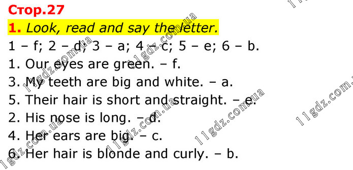 1. Look, read and say the letter. 1 – f; 2 – d; 3 – a; 4 – c; 5 – e; 6 – b. 1. Our eyes are green. – f. 3. My teeth are big and white. – a. 5. Their hair is short and straight. – e. 2. His nose is long. – d. 4. Her ears are big. – c. 6. Her hair is blonde and curly. – b.