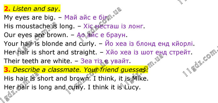 2. Listen and say. My eyes are big. – Май айс е біг. His moustache is long. – Хіс месташ із лонг. Our eyes are brown. – Ао айс е браун. Your hair is blonde and curly. – Йо хеа із блонд енд кйорлі. Her hair is short and straight. – Хйо хеа із шот енд стрейт. Their teeth are white. – Зеа тіз е увайт. 3. Describe a classmate. Your friend guesses. His hair is short and brown. I think, it is Mike. Her hair is long and curly. I think it is Lucy.