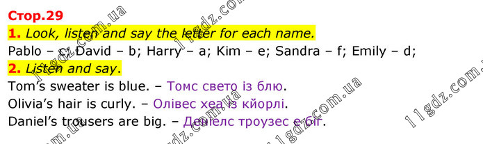 1. Look, listen and say the letter for each name. Pablo – c; David – b; Harry – a; Kim – e; Sandra – f; Emily – d; 2. Listen and say. Tom’s sweater is blue. – Томс свето із блю. Olivia’s hair is curly. – Олівес хеа із кйорлі. Daniel’s trousers are big. – Деніелс троузес е біг.