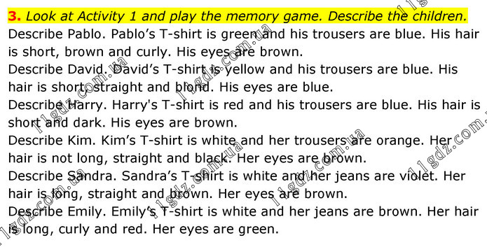 Look at Activity 1 and play the memory game. Describe the children. Describe Pablo. Pablo’s T-shirt is green and his trousers are blue. His hair is short, brown and curly. His eyes are brown. Describe David. David’s T-shirt is yellow and his trousers are blue. His hair is short, straight and blond. His eyes are blue. Describe Harry. Harry's T-shirt is red and his trousers are blue. His hair is short and dark. His eyes are brown. Describe Kim. Kim’s T-shirt is white and her trousers are orange. Her hair is not long, straight and black. Her eyes are brown. Describe Sandra. Sandra’s T-shirt is white and her jeans are violet. Her hair is long, straight and brown. Her eyes are brown. Describe Emily. Emily’s T-shirt is white and her jeans are brown. Her hair is long, curly and red. Her eyes are green.