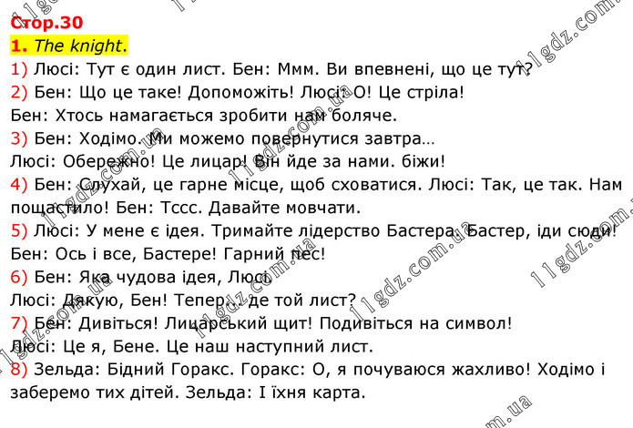 1. The knight. 1) Люсі: Тут є один лист. Бен: Ммм. Ви впевнені, що це тут? 2) Бен: Що це таке! Допоможіть! Люсі: О! Це стріла! Бен: Хтось намагається зробити нам боляче. 3) Бен: Ходімо. Ми можемо повернутися завтра… Люсі: Обережно! Це лицар! Він йде за нами. біжи! 4) Бен: Слухай, це гарне місце, щоб сховатися. Люсі: Так, це так. Нам пощастило! Бен: Тссс. Давайте мовчати. 5) Люсі: У мене є ідея. Тримайте лідерство Бастера. Бастер, іди сюди! Бен: Ось і все, Бастере! Гарний пес! 6) Бен: Яка чудова ідея, Люсі. Люсі: Дякую, Бен! Тепер... де той лист? 7) Бен: Дивіться! Лицарський щит! Подивіться на символ! Люсі: Це я, Бене. Це наш наступний лист. 8) Зельда: Бідний Горакс. Горакс: О, я почуваюся жахливо! Ходімо і заберемо тих дітей. Зельда: І їхня карта.