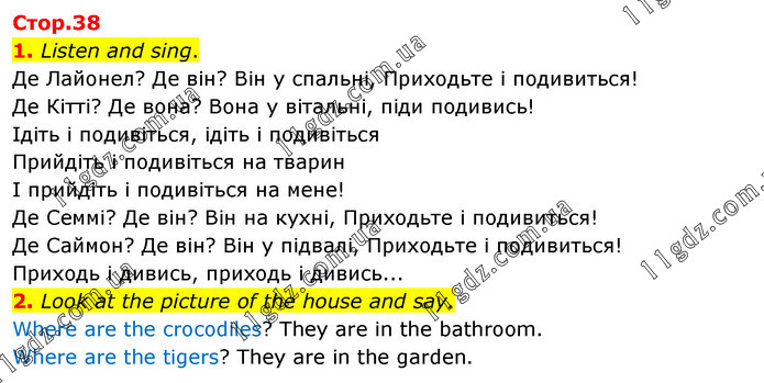 1. Listen and sing. Де Лайонел? Де він? Він у спальні, Приходьте і подивиться! Де Кітті? Де вона? Вона у вітальні, піди подивись! Ідіть і подивіться, ідіть і подивіться Прийдіть і подивіться на тварин І прийдіть і подивіться на мене! Де Семмі? Де він? Він на кухні, Приходьте і подивиться! Де Саймон? Де він? Він у підвалі, Приходьте і подивиться! Приходь і дивись, приходь і дивись... 2. Look at the picture of the house and say. Where are the crocodiles? They are in the bathroom. Where are the tigers? They are in the garden.