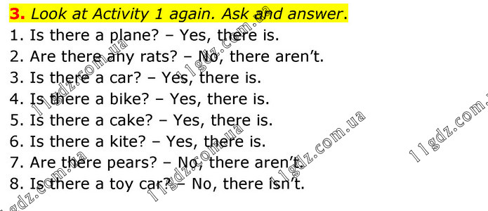 3. Look at Activity 1 again. Ask and answer. 1. Is there a plane? – Yes, there is. 2. Are there any rats? – No, there aren’t. 3. Is there a car? – Yes, there is. 4. Is there a bike? – Yes, there is. 5. Is there a cake? – Yes, there is. 6. Is there a kite? – Yes, there is. 7. Are there pears? – No, there aren’t. 8. Is there a toy car? – No, there isn’t.