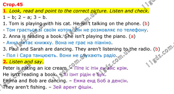 1. Look, read and point to the correct picture. Listen and check. 1 – b; 2 – a; 3 – b. 1. Tom is playing with his cat. He isn’t talking on the phone. (b) - Том грається зі своїм котом. Він не розмовляє по телефону. 2. Anna is reading a book. She isn’t playing the piano. (a) - Анна читає книжку. Вона не грає на піаніно. 3. Paul and Sarah are dancing. They aren’t listening to the radio. (b) - Пол і Сара танцюють. Вони не слухають радіо. 2. Listen and say. Peter is eating an ice cream. – Піте іс ітін ен айс крім. He isn’t reading a book. – Хі ізнт рідін е бук. Emma and Bob are dancing. – Емма енд Боб а денсін. They aren’t fishing. – Зей арент фішін.