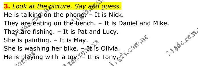 3. Look at the picture. Say and guess. He is talking on the phone. – It is Nick. They are eating on the bench. – It is Daniel and Mike. They are fishing. – It is Pat and Lucy. She is painting. – It is May. She is washing her bike. – It is Olivia. He is playing with a toy. – It is Tony.