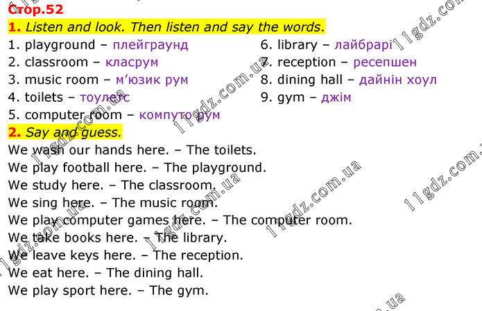 1. Listen and look. Then listen and say the words. 1. playground – плейграунд 2. classroom – класрум 3. music room – м’юзик рум 4. toilets – тоулетс 5. computer room – компуто рум 6. library – лайбрарі 7. reception – ресепшен 8. dining hall – дайнін хоул 9. gym – джім 2. Say and guess. We wash our hands here. – The toilets. We play football here. – The playground. We study here. – The classroom. We sing here. – The music room. We play computer games here. – The computer room. We take books here. – The library. We leave keys here. – The reception. We eat here. – The dining hall. We play sport here. – The gym.