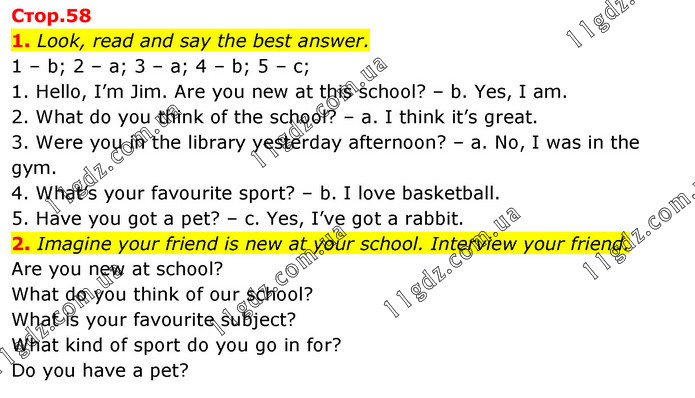 1. Look, read and say the best answer. 1 – b; 2 – a; 3 – a; 4 – b; 5 – c; 1. Hello, I’m Jim. Are you new at this school? – b. Yes, I am. 2. What do you think of the school? – a. I think it’s great. 3. Were you in the library yesterday afternoon? – a. No, I was in the gym. 4. What’s your favourite sport? – b. I love basketball. 5. Have you got a pet? – c. Yes, I’ve got a rabbit. 2. Imagine your friend is new at your school. Interview your friend. Are you new at school? What do you think of our school? What is your favourite subject? What kind of sport do you go in for? Do you have a pet?