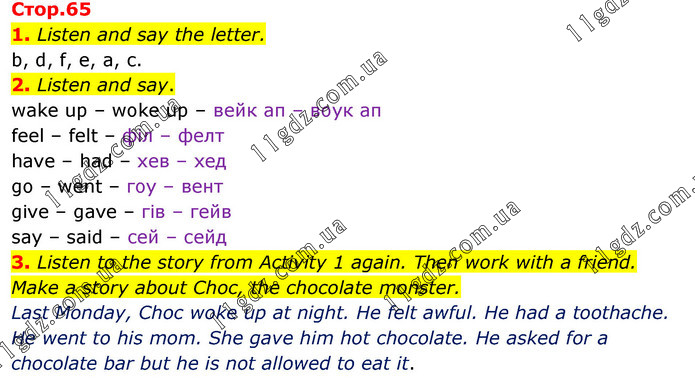 1. Listen and say the letter. b, d, f, e, a, c. 2. Listen and say. wake up – woke up – вейк ап – воук ап feel – felt – філ – фелт have – had – хев – хед go – went – гоу – вент give – gave – гів – гейв say – said – сей – сейд 3. Listen to the story from Activity 1 again. Then work with a friend. Make a story about Choc, the chocolate monster. Last Monday, Choc woke up at night. He felt awful. He had a toothache. He went to his mom. She gave him hot chocolate. He asked for a chocolate bar but he is not allowed to eat it.