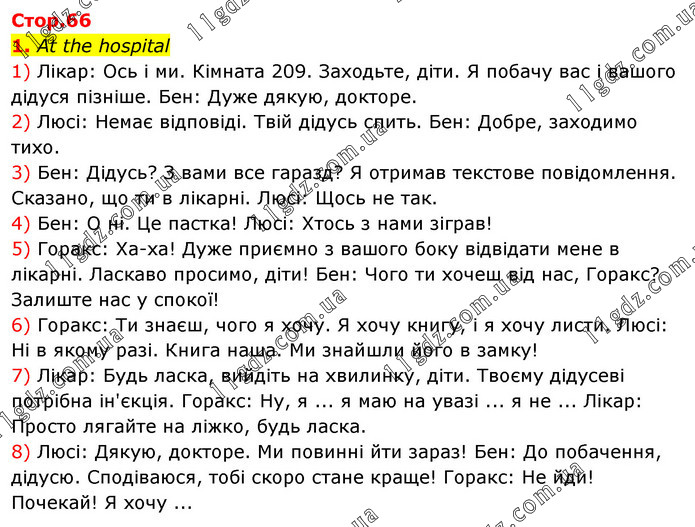 1. At the hospital 1) Лікар: Ось і ми. Кімната 209. Заходьте, діти. Я побачу вас і вашого дідуся пізніше. Бен: Дуже дякую, докторе. 2) Люсі: Немає відповіді. Твій дідусь спить. Бен: Добре, заходимо тихо. 3) Бен: Дідусь? З вами все гаразд? Я отримав текстове повідомлення. Сказано, що ти в лікарні. Люсі: Щось не так. 4) Бен: О ні. Це пастка! Люсі: Хтось з нами зіграв! 5) Горакс: Ха-ха! Дуже приємно з вашого боку відвідати мене в лікарні. Ласкаво просимо, діти! Бен: Чого ти хочеш від нас, Горакс? Залиште нас у спокої! 6) Горакс: Ти знаєш, чого я хочу. Я хочу книгу, і я хочу листи. Люсі: Ні в якому разі. Книга наша. Ми знайшли його в замку! 7) Лікар: Будь ласка, вийдіть на хвилинку, діти. Твоєму дідусеві потрібна ін'єкція. Горакс: Ну, я ... я маю на увазі ... я не ... Лікар: Просто лягайте на ліжко, будь ласка. 8) Люсі: Дякую, докторе. Ми повинні йти зараз! Бен: До побачення, дідусю. Сподіваюся, тобі скоро стане краще! Горакс: Не йди! Почекай! Я хочу ...