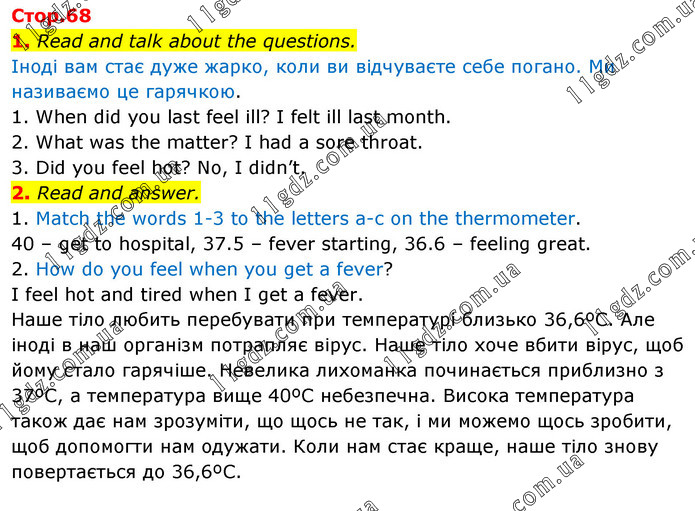 1. Read and talk about the questions. Іноді вам стає дуже жарко, коли ви відчуваєте себе погано. Ми називаємо це гарячкою. 1. When did you last feel ill? I felt ill last month. 2. What was the matter? I had a sore throat. 3. Did you feel hot? No, I didn’t. 2. Read and answer. 1. Match the words 1-3 to the letters a-c on the thermometer. 40 – get to hospital, 37.5 – fever starting, 36.6 – feeling great. 2. How do you feel when you get a fever? I feel hot and tired when I get a fever. Наше тіло любить перебувати при температурі близько 36,6ºC. Але іноді в наш організм потрапляє вірус. Наше тіло хоче вбити вірус, щоб йому стало гарячіше. Невелика лихоманка починається приблизно з 37ºC, а температура вище 40ºC небезпечна. Висока температура також дає нам зрозуміти, що щось не так, і ми можемо щось зробити, щоб допомогти нам одужати. Коли нам стає краще, наше тіло знову повертається до 36,6ºC.
