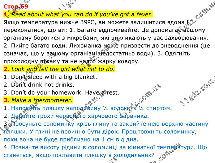 1. Read about what you can do if you’ve got a fever. Якщо температура нижче 39ºC, ви можете залишитися вдома і переконатися, що ви: 1. Багато відпочивайте. Це допомагає вашому організму боротися з мікробами, які викликають у вас захворювання. 2. Пийте багато води. Лихоманка може призвести до зневоднення (це означає, що у вашому організмі недостатньо води). 3. Одягніть прохолодну піжаму та не надто жарку ковдру. 2. Look and tell the girl what not to do. 1. Don’t sleep with a big blanket. 2. Don’t drink hot drinks. 3. Don’t do your homework. Have a rest. 3. Make a thermometer. 1. Наповніть пляшку наполовину ¼ водою та ¼ спиртом. 2. Додайте трохи червоного харчового барвника. 3. Просуньте соломинку крізь глину та закрийте нею верхню частину пляшки. У глині не повинно бути дірок. Проштовхніть соломинку, поки вона не буде приблизно на 1 см від дна. 4. Позначте висоту рідини в соломинці за кімнатної температури. Що станеться, якщо поставити пляшку в холодильник?