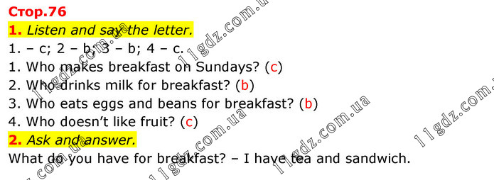 1. Listen and say the letter. 1. – с; 2 – b; 3 – b; 4 – c. 1. Who makes breakfast on Sundays? (c) 2. Who drinks milk for breakfast? (b) 3. Who eats eggs and beans for breakfast? (b) 4. Who doesn’t like fruit? (c) 2. Ask and answer. What do you have for breakfast? – I have tea and sandwich.