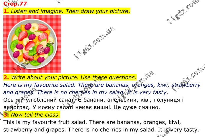 1. Listen and imagine. Then draw your picture. 2. Write about your picture. Use these questions. Here is my favourite salad. There are bananas, oranges, kiwi, strawberry and grapes. There is no cherries in my salad. It is very tasty. Ось мій улюблений салат. Є банани, апельсини, ківі, полуниця і виноград. У моєму салаті немає вишні. Це дуже смачно. 3. Now tell the class. This is my favourite fruit salad. There are bananas, oranges, kiwi, strawberry and grapes. There is no cherries in my salad. It is very tasty.