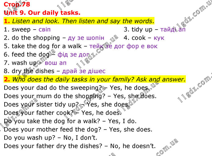 Unit 9. Our daily tasks. 1. Listen and look. Then listen and say the words. 1. sweep – свіп 2. do the shopping – ду зе шопін 3. tidy up – тайді ап 4. cook – кук 5. take the dog for a walk – тейк зе дог фор е вок 6. feed the dog – фід зе дог 7. wash up – вош ап 8. dry the dishes – драй зе дішес 2. Who does the daily tasks in your family? Ask and answer. Does your dad do the sweeping? – Yes, he does. Does your mum do the shopping? – Yes, she does. Does your sister tidy up? – Yes, she does. Does your father cook? – Yes, he does. Do you take the dog for a walk? – Yes, I do. Does your mother feed the dog? – Yes, she does. Do you wash up? – No, I don’t. Does your father dry the dishes? – No, he doesn’t.