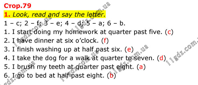 1. Look, read and say the letter. 1 – с; 2 – f; 3 – e; 4 – d; 5 – a; 6 – b. 1. I start doing my homework at quarter past five. (c) 2. I have dinner at six o’clock. (f) 3. I finish washing up at half past six. (e) 4. I take the dog for a walk at quarter to seven. (d) 5. I brush my teeth at quarter past eight. (a) 6. I go to bed at half past eight. (b)