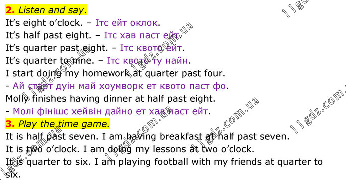 2. Listen and say. It’s eight o’clock. – Ітс ейт оклок. It’s half past eight. – Ітс хав паст ейт. It’s quarter past eight. – Ітс квото ейт. It’s quarter to nine. – Ітс квото ту найн. I start doing my homework at quarter past four. - Ай старт дуін май хоумворк ет квото паст фо. Molly finishes having dinner at half past eight. - Молі фінішс хейвін дайно ет хав паст ейт. 3. Play the time game. It is half past seven. I am having breakfast at half past seven. It is two o’clock. I am doing my lessons at two o’clock. It is quarter to six. I am playing football with my friends at quarter to six.