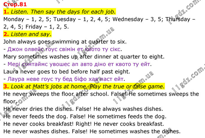1. Listen. Then say the days for each job. Monday – 1, 2, 5; Tuesday – 1, 2, 4, 5; Wednesday – 3, 5; Thursday – 2, 4, 5; Friday – 1, 2, 5. 2. Listen and say. John always goes swimming at quarter to six. - Джон олвейс гоус свімін ет квото ту сікс. Mary sometimes washes up after dinner at quarter to eight. - Мері сомтаймс увошес ап авто діно ет квото ту ейт. Laura never goes to bed before half past eight. - Лаура неве гоус ту бед біфо хав паст ейт. 3. Look at Matt’s jobs at home. Play the true or false game. He never sweeps the floor after school. False! He sometimes sweeps the floor. He never dries the dishes. False! He always washes dishes. He never feeds the dog. False! He sometimes feeds the dog. He never cooks breakfast! Right! He never cooks breakfast. He never washes dishes. False! He sometimes washes the dishes.
