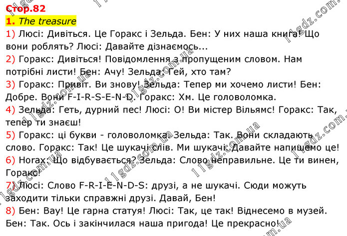1. The treasure 1) Люсі: Дивіться. Це Горакс і Зельда. Бен: У них наша книга! Що вони роблять? Люсі: Давайте дізнаємось... 2) Горакс: Дивіться! Повідомлення з пропущеним словом. Нам потрібні листи! Бен: Ачу! Зельда: Гей, хто там? 3) Горакс: Привіт. Ви знову! Зельда: Тепер ми хочемо листи! Бен: Добре. Вони F-I-R-S-E-N-D. Горакс: Хм. Це головоломка. 4) Зельда: Геть, дурний пес! Люсі: О! Ви містер Вільямс! Горакс: Так, тепер ти знаєш! 5) Горакс: ці букви - головоломка. Зельда: Так. Вони складають слово. Горакс: Так! Це шукачі слів. Ми шукачі. Давайте напишемо це! 6) Horax: Що відбувається? Зельда: Слово неправильне. Це ти винен, Горакс! 7) Люсі: Слово F-R-I-E-N-D-S: друзі, а не шукачі. Сюди можуть заходити тільки справжні друзі. Давай, Бен! 8) Бен: Вау! Це гарна статуя! Люсі: Так, це так! Віднесемо в музей. Бен: Так. Ось і закінчилася наша пригода! Це прекрасно!