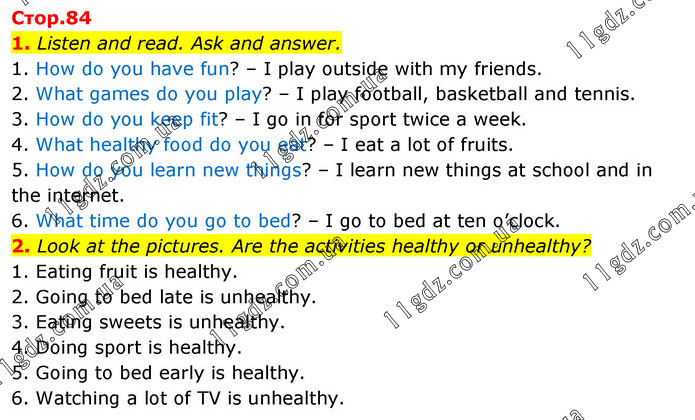 1. Listen and read. Ask and answer. 1. How do you have fun? – I play outside with my friends. 2. What games do you play? – I play football, basketball and tennis. 3. How do you keep fit? – I go in for sport twice a week. 4. What healthy food do you eat? – I eat a lot of fruits. 5. How do you learn new things? – I learn new things at school and in the internet. 6. What time do you go to bed? – I go to bed at ten o’clock. 2. Look at the pictures. Are the activities healthy or unhealthy? 1. Eating fruit is healthy. 2. Going to bed late is unhealthy. 3. Eating sweets is unhealthy. 4. Doing sport is healthy. 5. Going to bed early is healthy. 6. Watching a lot of TV is unhealthy.