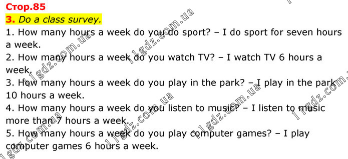 3. Do a class survey. 1. How many hours a week do you do sport? – I do sport for seven hours a week. 2. How many hours a week do you watch TV? – I watch TV 6 hours a week. 3. How many hours a week do you play in the park? – I play in the park 10 hours a week. 4. How many hours a week do you listen to music? – I listen to music more than 7 hours a week. 5. How many hours a week do you play computer games? – I play computer games 6 hours a week.