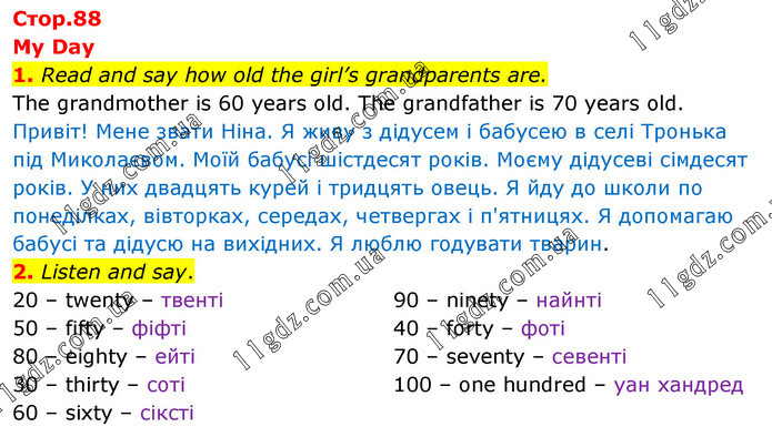 My Day 1. Read and say how old the girl’s grandparents are. The grandmother is 60 years old. The grandfather is 70 years old. Привіт! Мене звати Ніна. Я живу з дідусем і бабусею в селі Тронька під Миколаєвом. Моїй бабусі шістдесят років. Моєму дідусеві сімдесят років. У них двадцять курей і тридцять овець. Я йду до школи по понеділках, вівторках, середах, четвергах і п'ятницях. Я допомагаю бабусі та дідусю на вихідних. Я люблю годувати тварин. 2. Listen and say. 20 – twenty – твенті 50 – fifty – фіфті 80 – eighty – ейті 30 – thirty – соті 60 – sixty – сіксті 90 – ninety – найнті 40 – forty – фоті 70 – seventy – севенті 100 – one hundred – уан хандред
