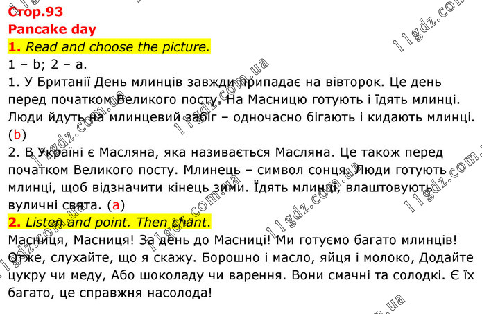 Pancake day 1. Read and choose the picture. 1 – b; 2 – a. 1. У Британії День млинців завжди припадає на вівторок. Це день перед початком Великого посту. На Масницю готують і їдять млинці. Люди йдуть на млинцевий забіг – одночасно бігають і кидають млинці. (b) 2. В Україні є Масляна, яка називається Масляна. Це також перед початком Великого посту. Млинець – символ сонця. Люди готують млинці, щоб відзначити кінець зими. Їдять млинці, влаштовують вуличні свята. (a) 2. Listen and point. Then chant. Масниця, Масниця! За день до Масниці! Ми готуємо багато млинців! Отже, слухайте, що я скажу. Борошно і масло, яйця і молоко, Додайте цукру чи меду, Або шоколаду чи варення. Вони смачні та солодкі. Є їх багато, це справжня насолода!