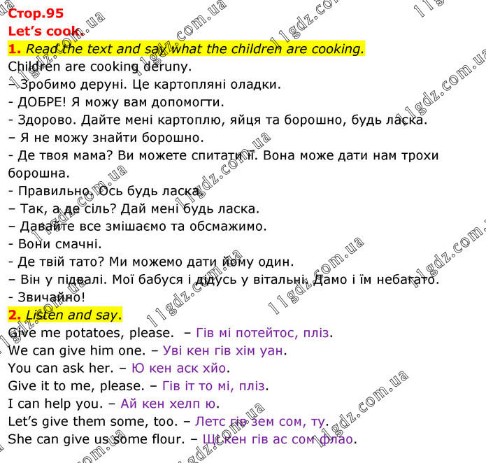 Let’s cook. 1. Read the text and say what the children are cooking. Children are cooking deruny. – Зробимо деруні. Це картопляні оладки. - ДОБРЕ! Я можу вам допомогти. - Здорово. Дайте мені картоплю, яйця та борошно, будь ласка. – Я не можу знайти борошно. - Де твоя мама? Ви можете спитати її. Вона може дати нам трохи борошна. - Правильно. Ось будь ласка. – Так, а де сіль? Дай мені будь ласка. – Давайте все змішаємо та обсмажимо. - Вони смачні. - Де твій тато? Ми можемо дати йому один. – Він у підвалі. Мої бабуся і дідусь у вітальні. Дамо і їм небагато. - Звичайно! 2. Listen and say. Give me potatoes, please. – Гів мі потейтос, пліз. We can give him one. – Уві кен гів хім уан. You can ask her. – Ю кен аск хйо. Give it to me, please. – Гів іт то мі, пліз. I can help you. – Ай кен хелп ю. Let’s give them some, too. – Летс гів зем сом, ту. She can give us some flour. – Щі кен гів ас сом флао.
