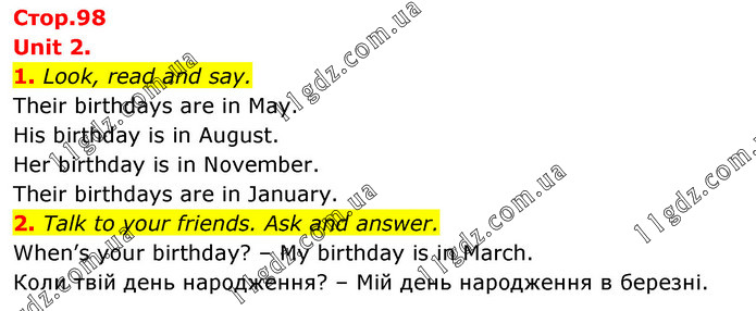 Unit 2. 1. Look, read and say. Their birthdays are in May. His birthday is in August. Her birthday is in November. Their birthdays are in January. 2. Talk to your friends. Ask and answer. When’s your birthday? – My birthday is in March. Коли твій день народження? – Мій день народження в березні.
